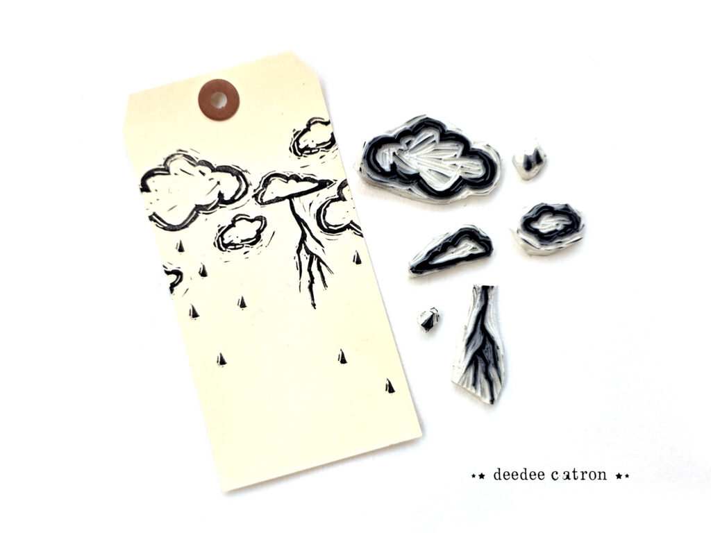 DeeDee encouraged students to draw & carve their own elemental stamps for a SWIRLING & WET Scene.